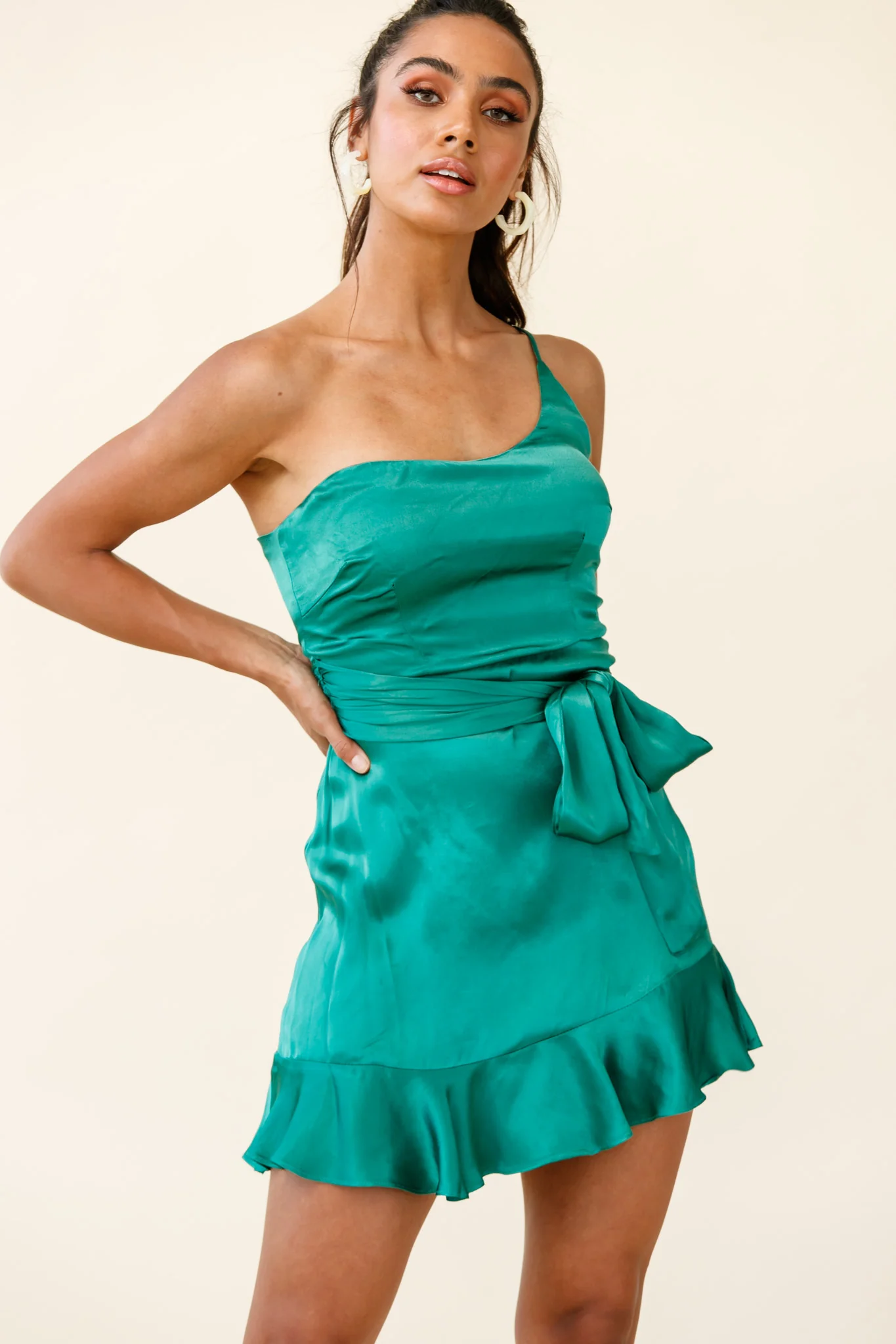 Don't Wait Up One Shoulder Waist Tie Dress Jade