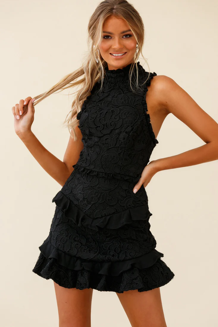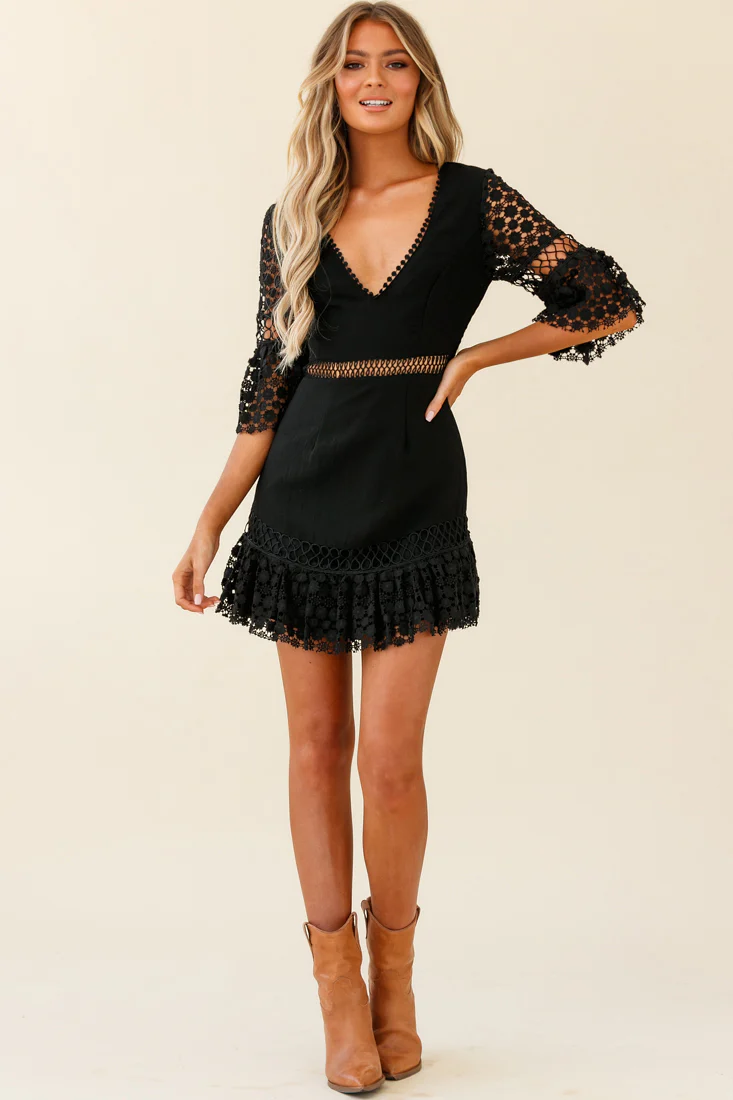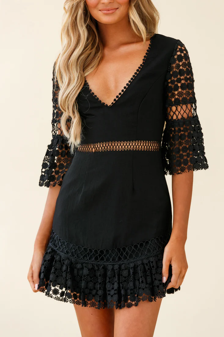 Believe It Crochet Detail Fluted Hem Dress Black
