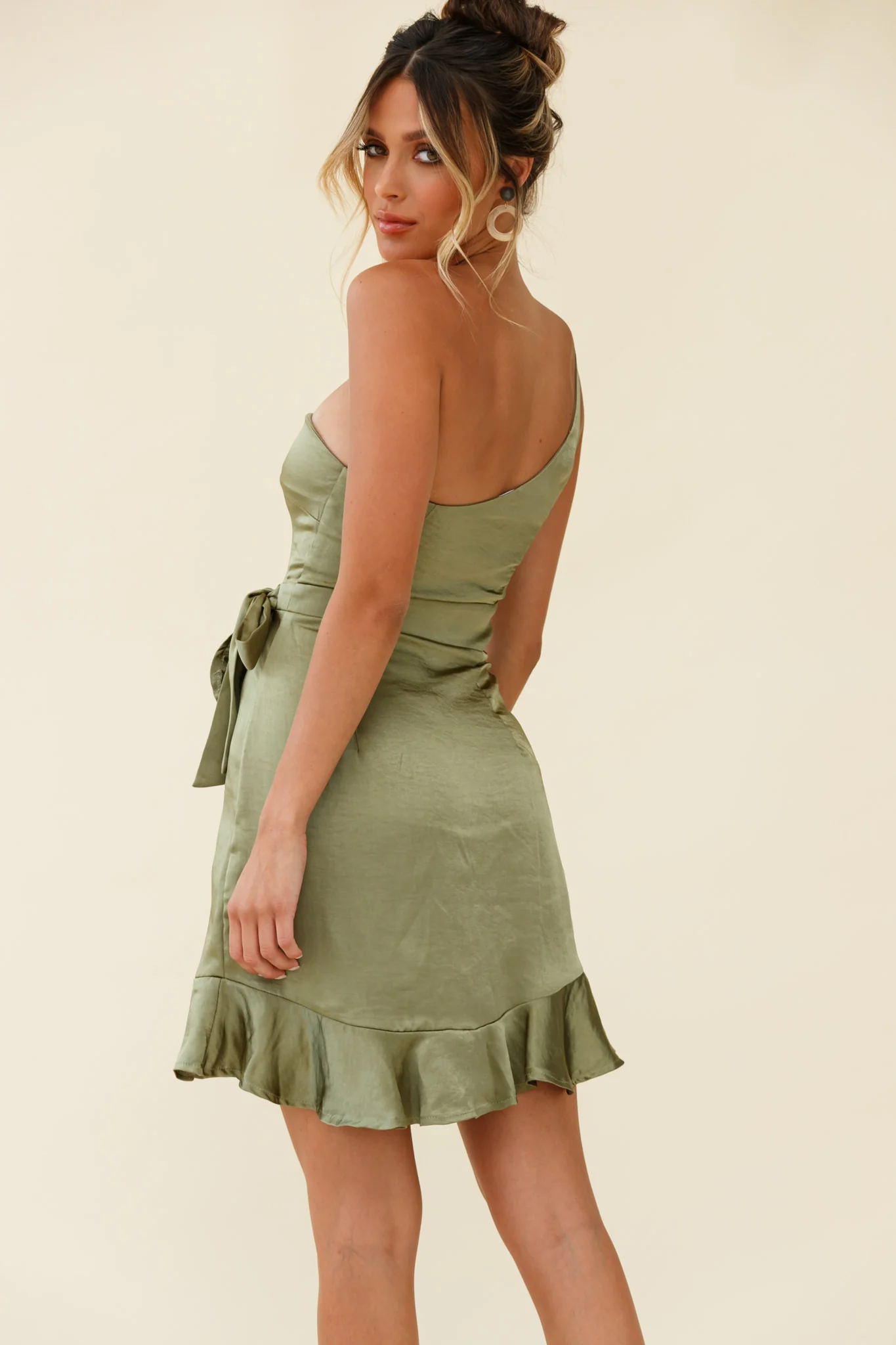 Waiting For Tonight One Shoulder Faux Wrap Dress Olive
