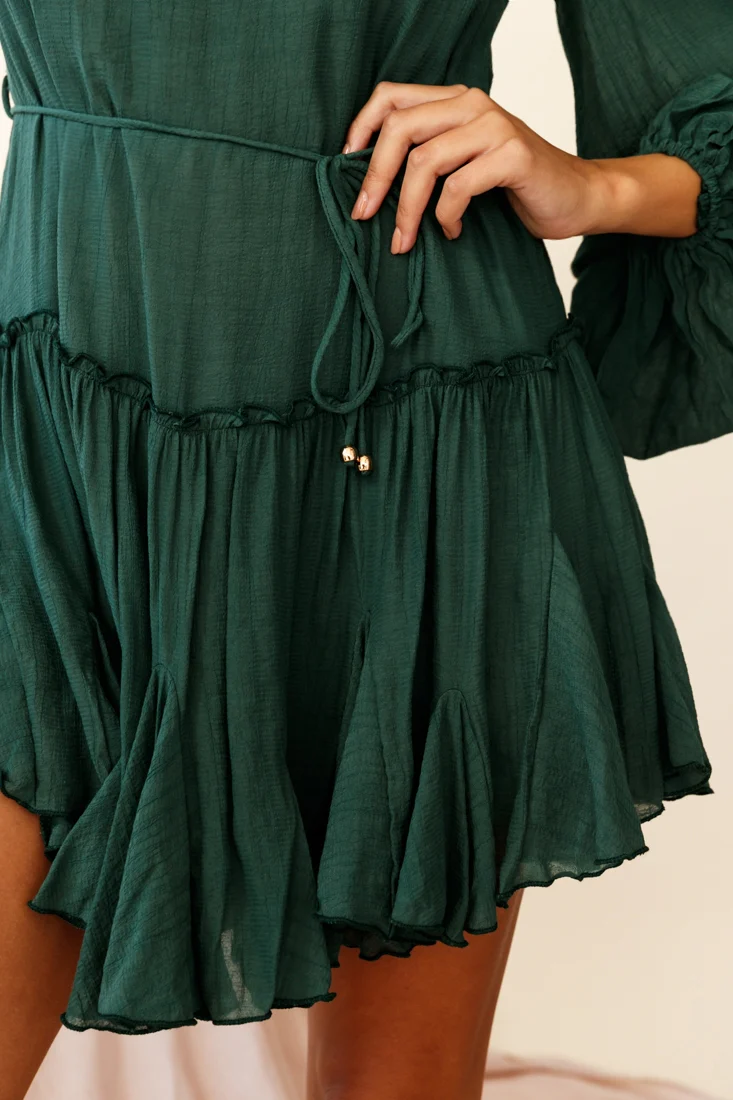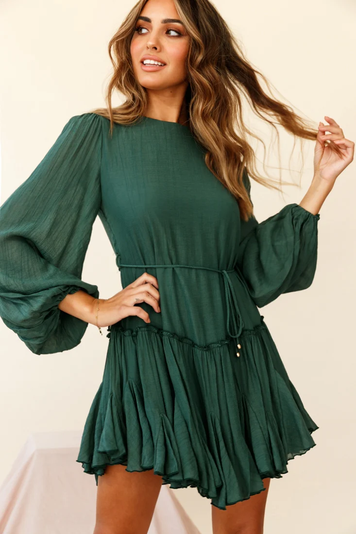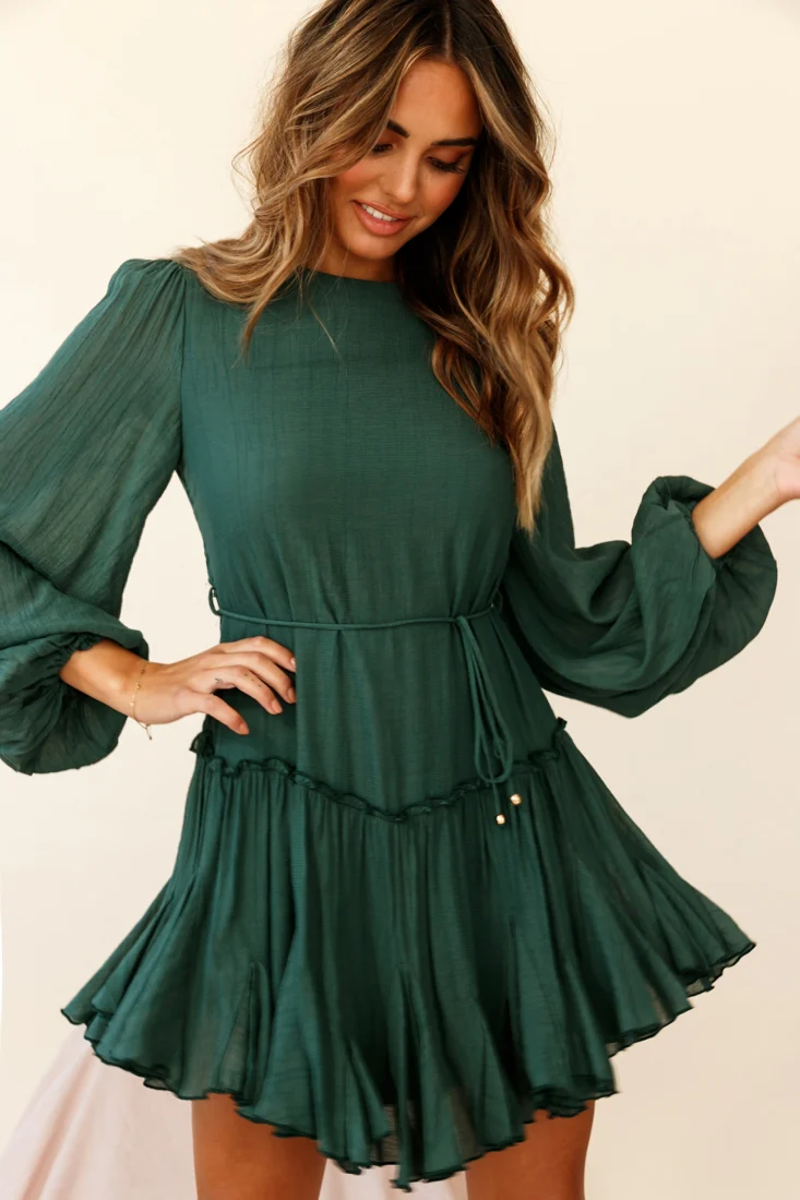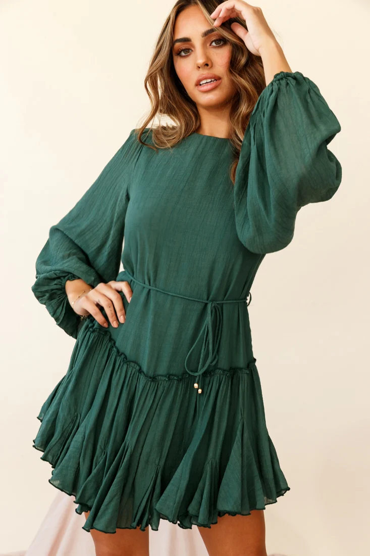 Rosabel Balloon Sleeve Fluted Hem Dress Green