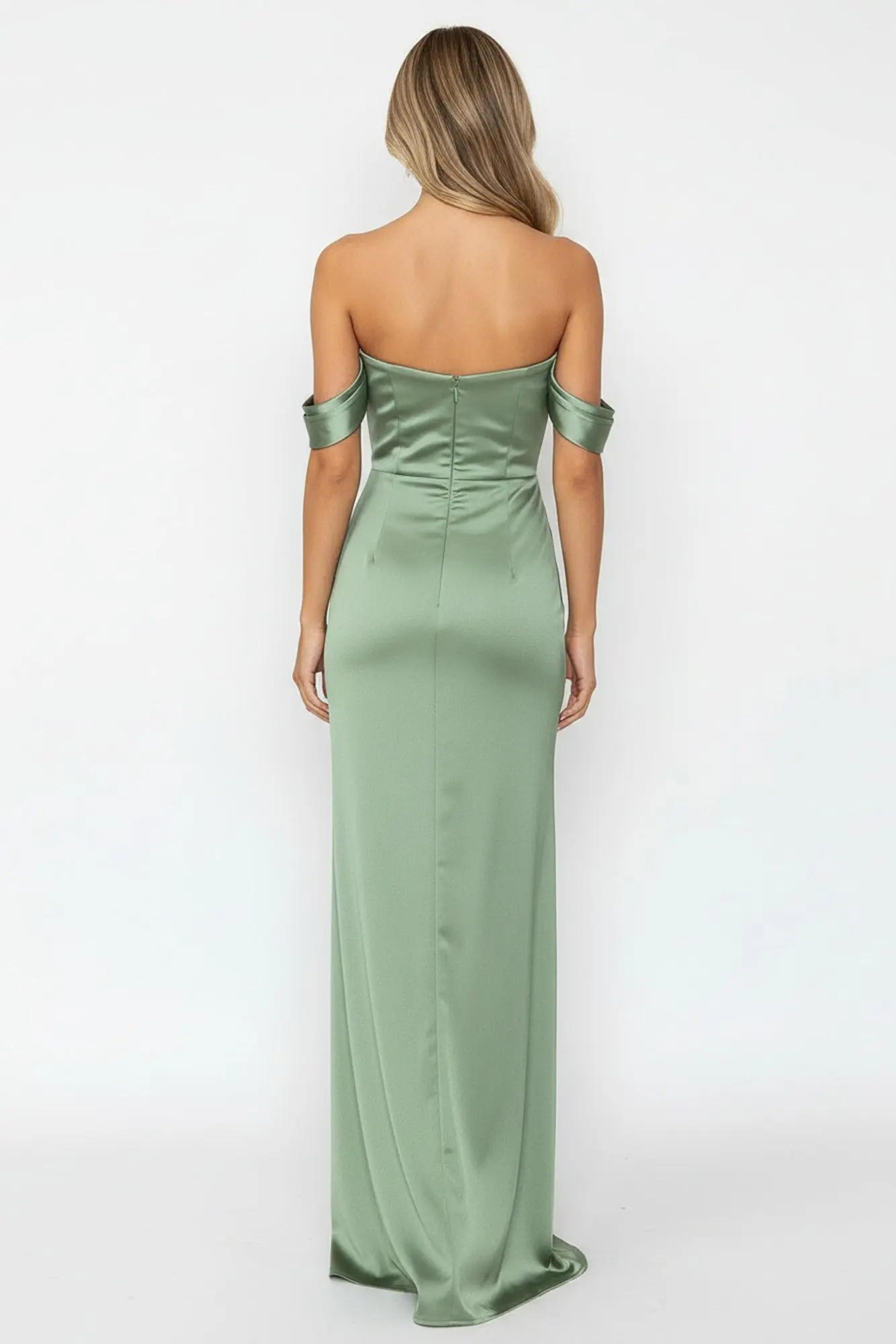 Silken Starlet Off Shoulder Satin Maxi Dress Olive