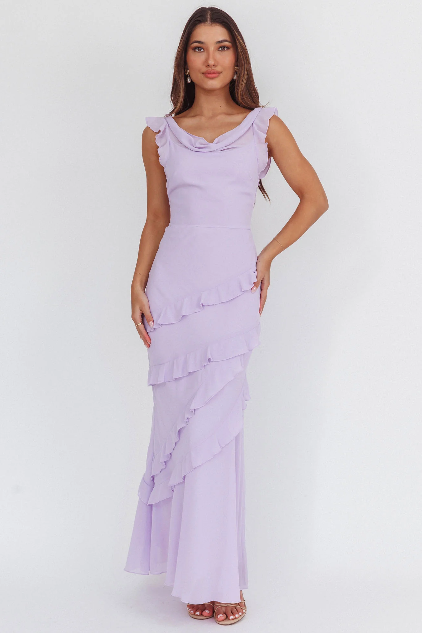 Sangria Cowl Neck Frill Maxi Dress Lilac