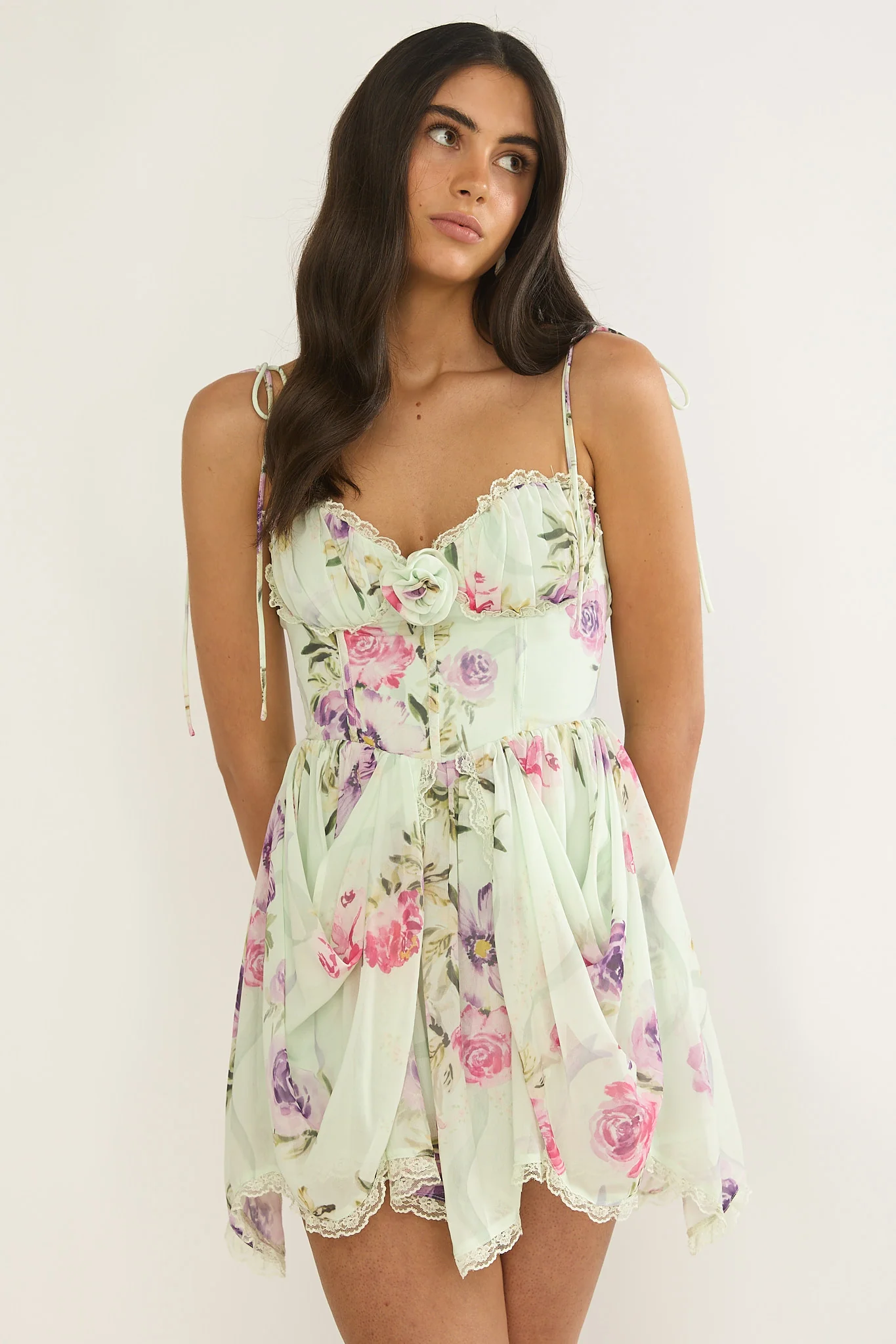Gisora Tied Back Lace Trim Romper Floral Mint