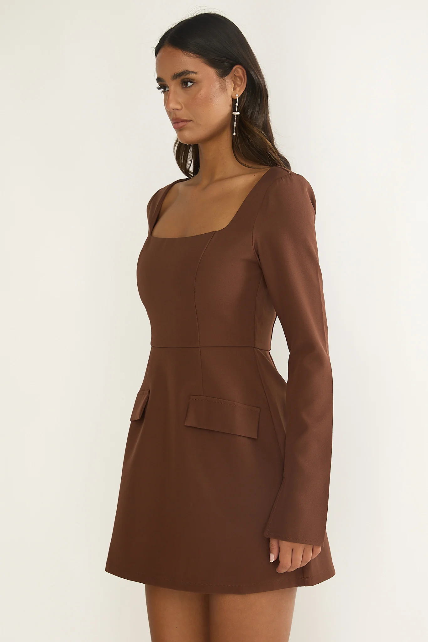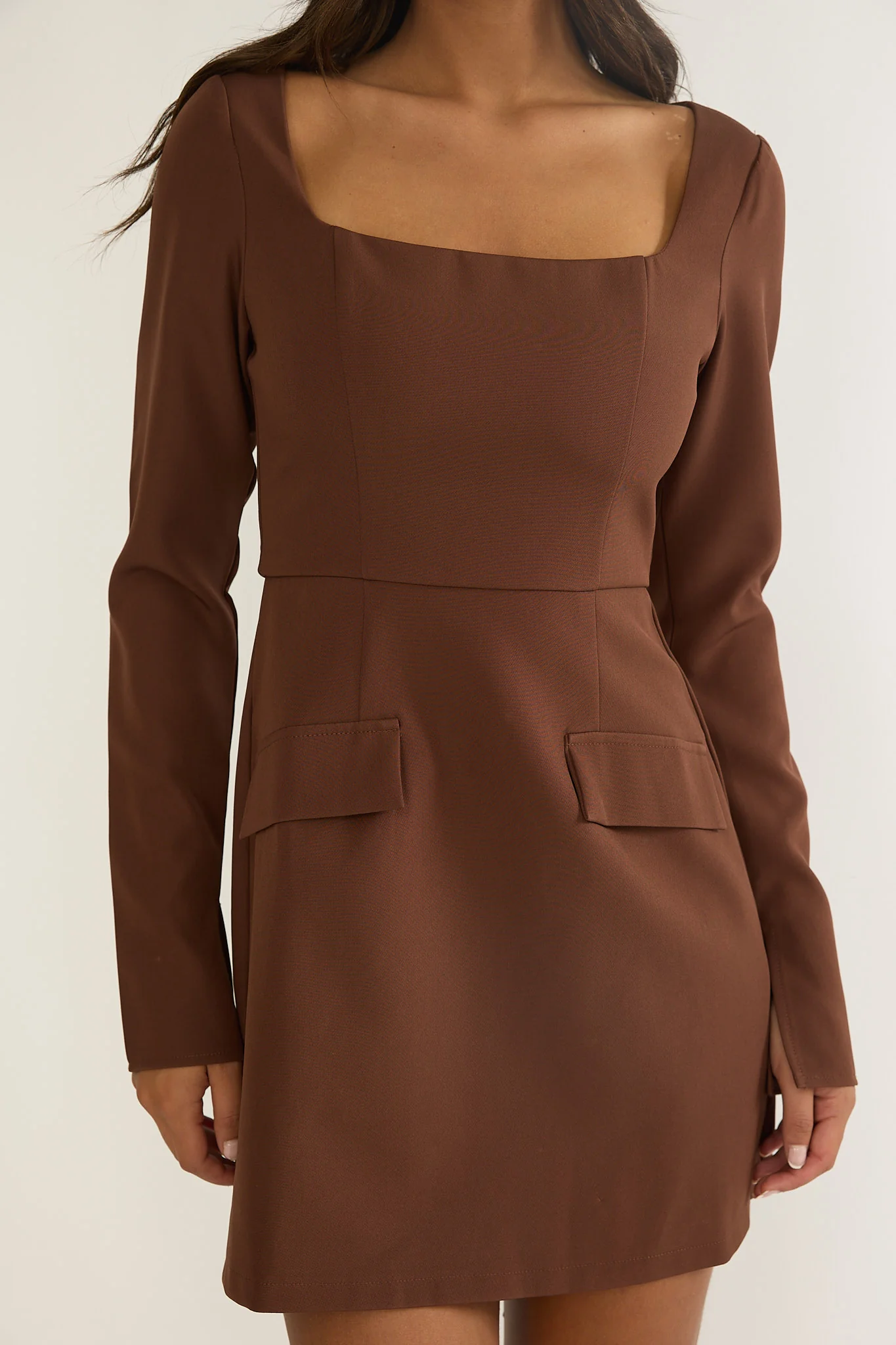 Calenne Long Sleeve Faux Pocket Mini Dress Coffee