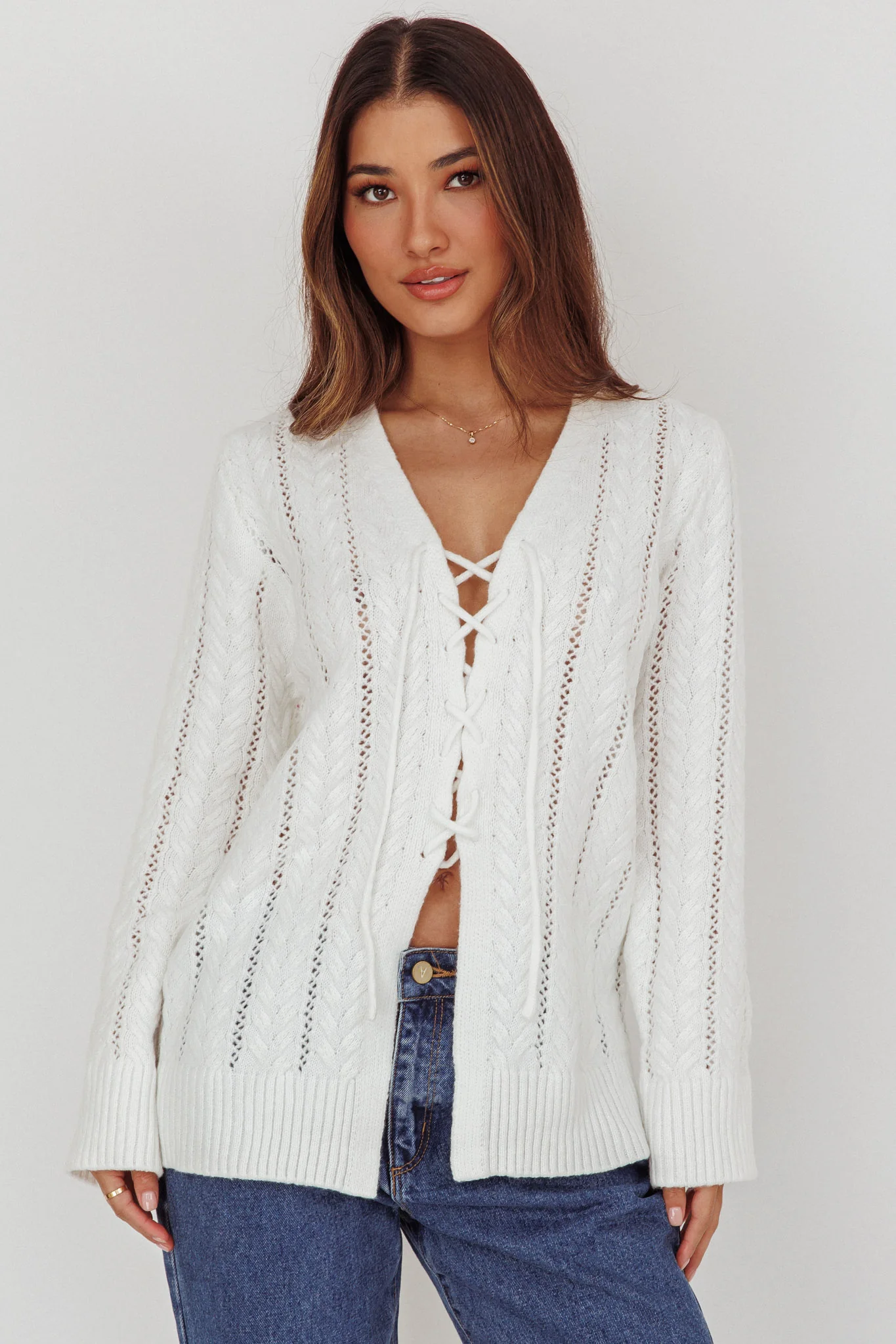 Seattle Lace-Up Front Knit Top White