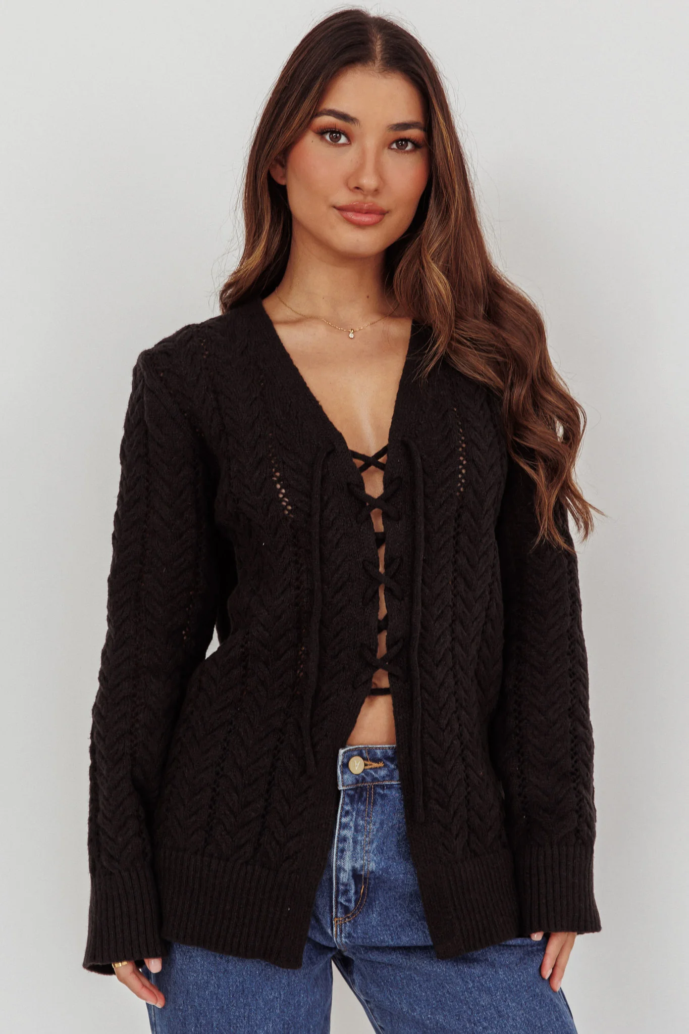 Seattle Lace-Up Front Knit Top Black