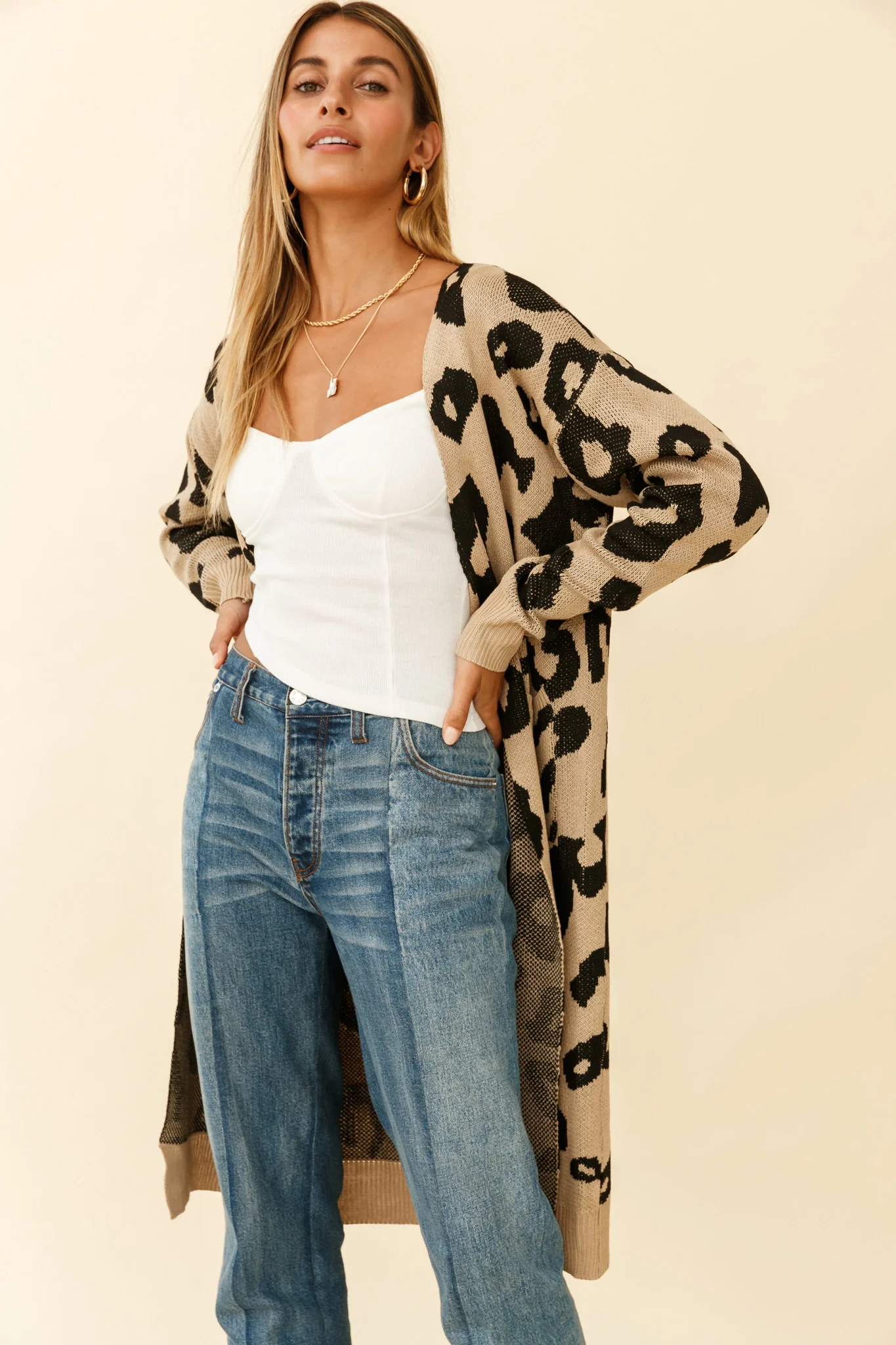 Switch It Up Longline Pocket Knit Cardigan Animal Print Beige