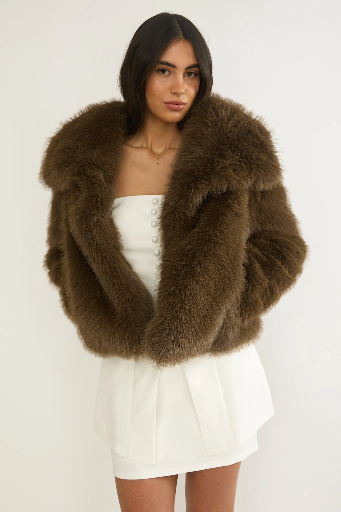 Harlequinn Oversized Lapel Faux Fur Jacket Coffee