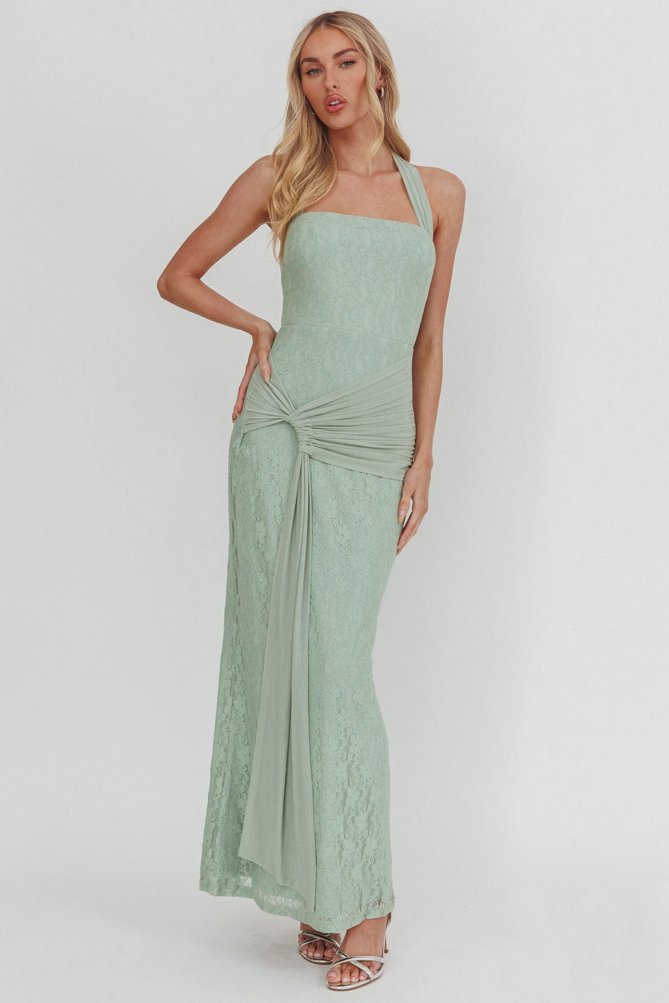 Luli Waist Sash Halter Maxi Dress Lace Sage