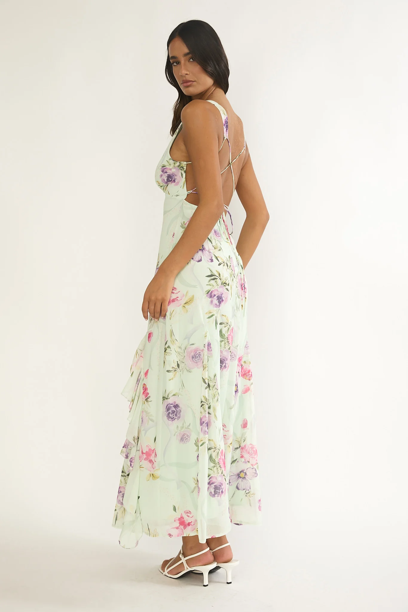 Elenya Strappy Back Ruffle Trim Maxi Dress Mint Floral