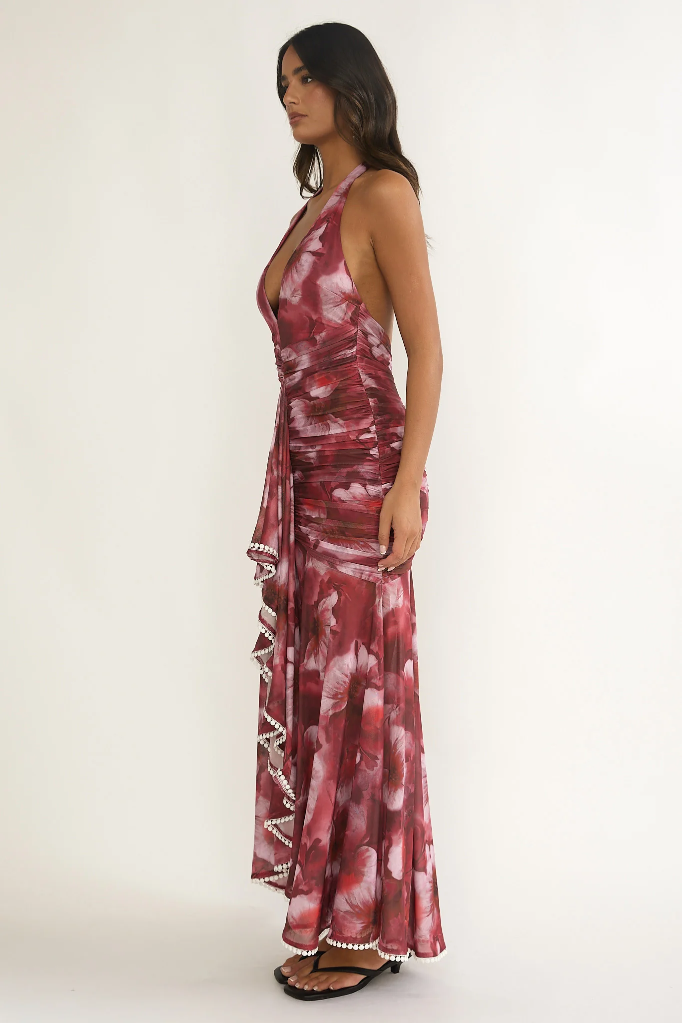 Kamilah Ruched Ruffle Maxi Dress Floral Red