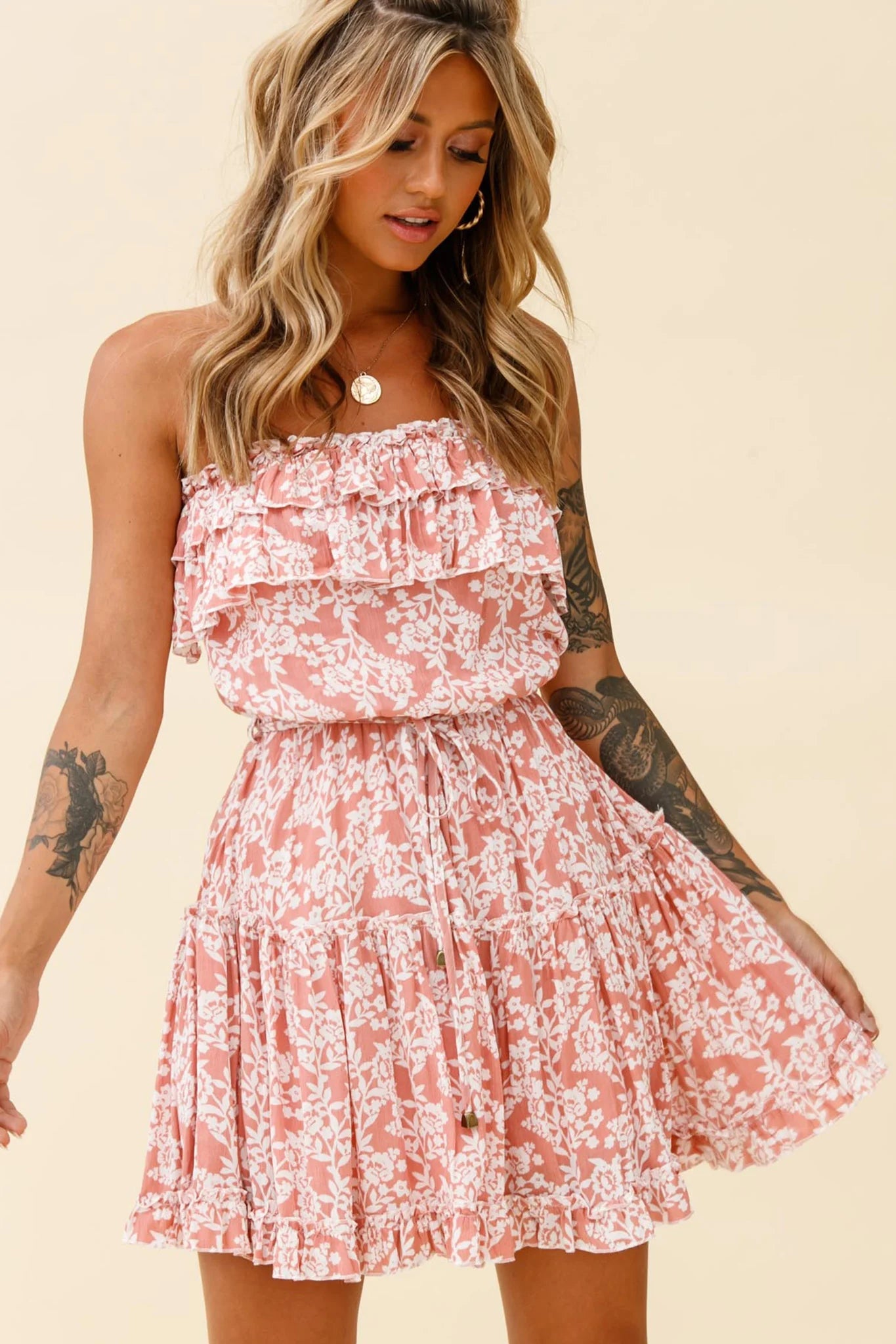 Make an entrance in our pretty Raquel dress. Featuring a strapless, layered design, frill-trimmed hemline and waist tie with golden toggles. It's perfect for a stylish brunch with your bffs. Team it with a straw hat and wedges.