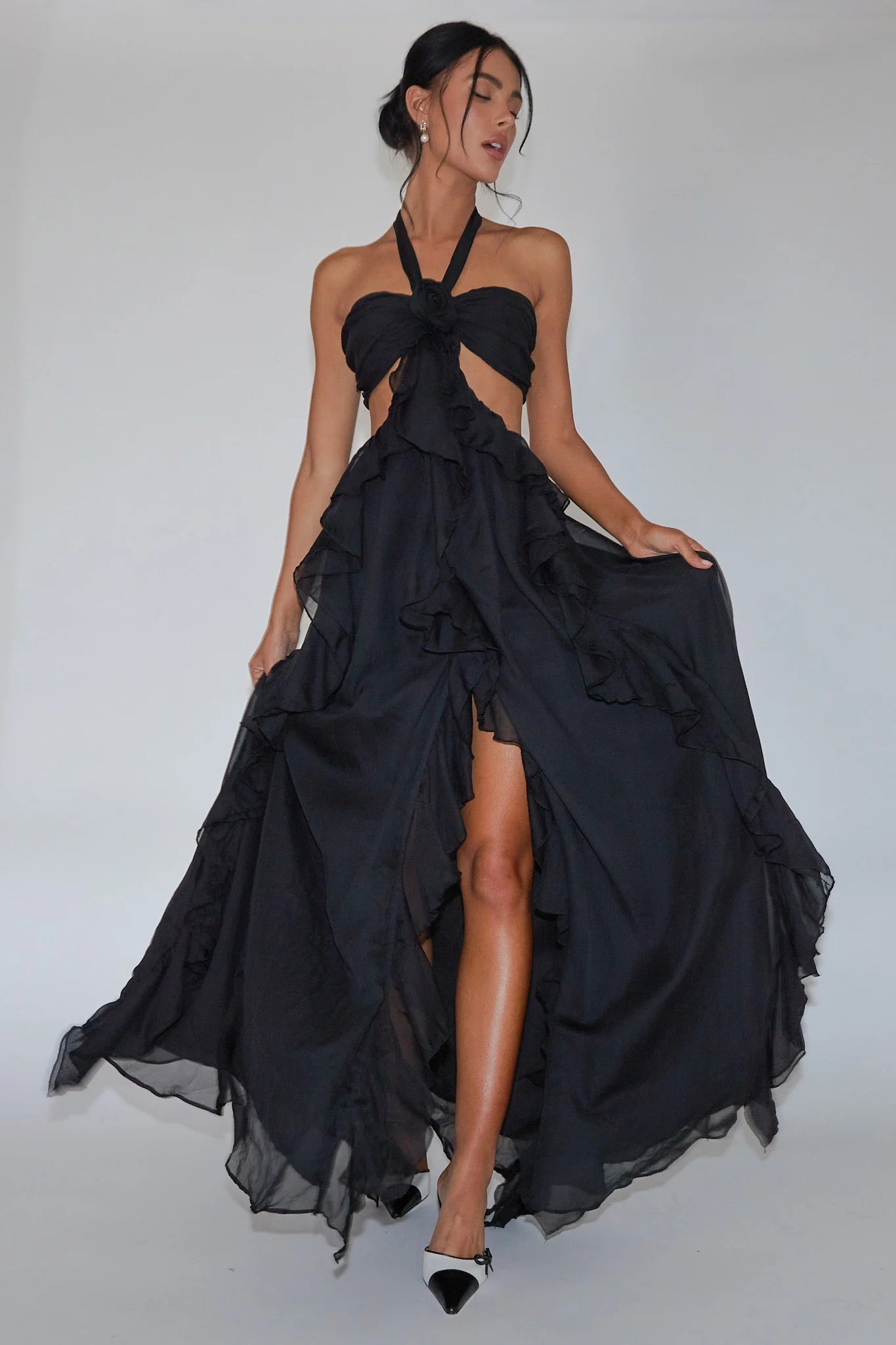 You're a real showstopper in our gorgeous Santiago maxi dress. Featuring a halter neckline and dramatic ruffle detail throughout, this one is sure to send you straight to the best-dressed list! It's perfect for a special birthday celebration or gala event. Team it with strappy, black heels and a purse for an ultra glam look.